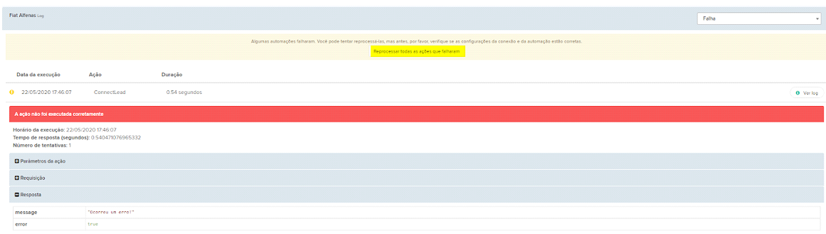 Ao salvar, clique em log para reprocessar a integração.