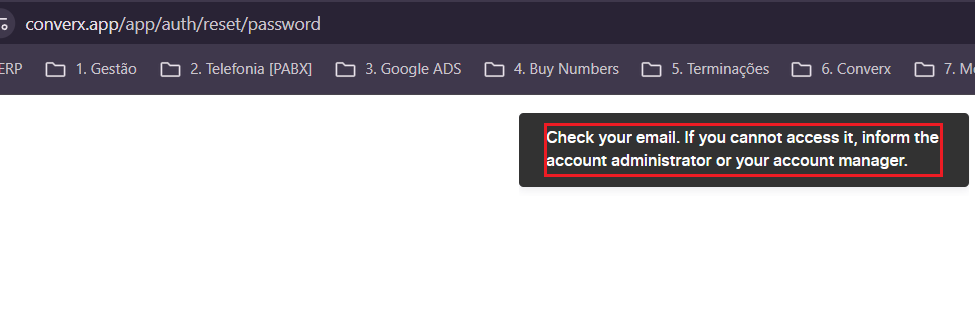 Deverá apresentar essa mensagem: "Verifique seu e-mail. Se você não conseguir acessá-lo, informe o administrador da conta ou o seu gerente de conta."