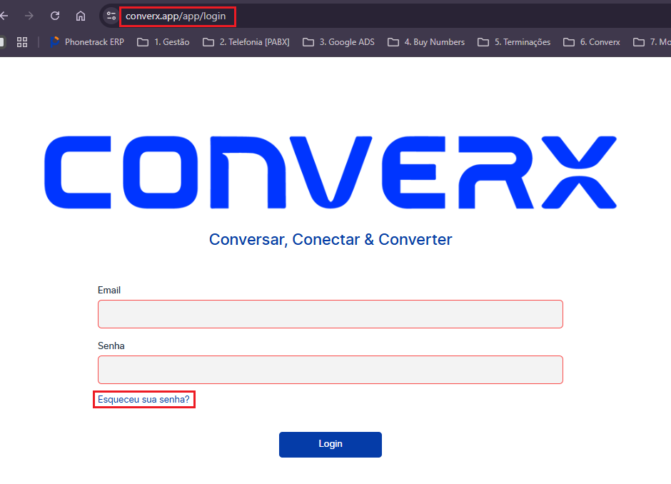 Na página de reset, insira o e-mail cadastrado na sua conta Converx;