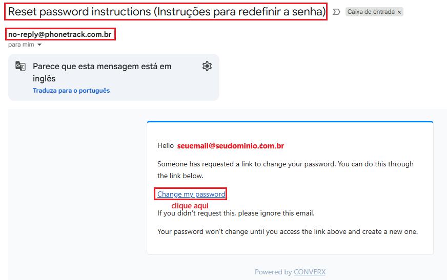 Você receberá, a partir desse endereço (no-reply@phonetrack.com.br), uma mensagem com o título “Reset password instructions” (Instruções para redefinir a senha), conforme o exemplo abaixo, para concluir o processo de redefinição de senha.
