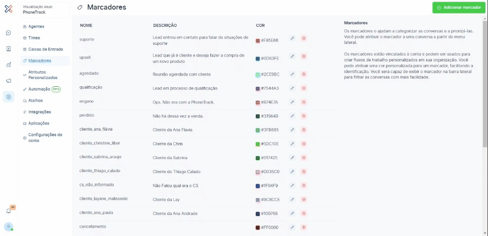 Dica: certifique-se de dar nomes significativos aos marcadores, e também adicionar cores diferentes, para que assim você possa identificar de uma só vez a categoria em que a conversa está.