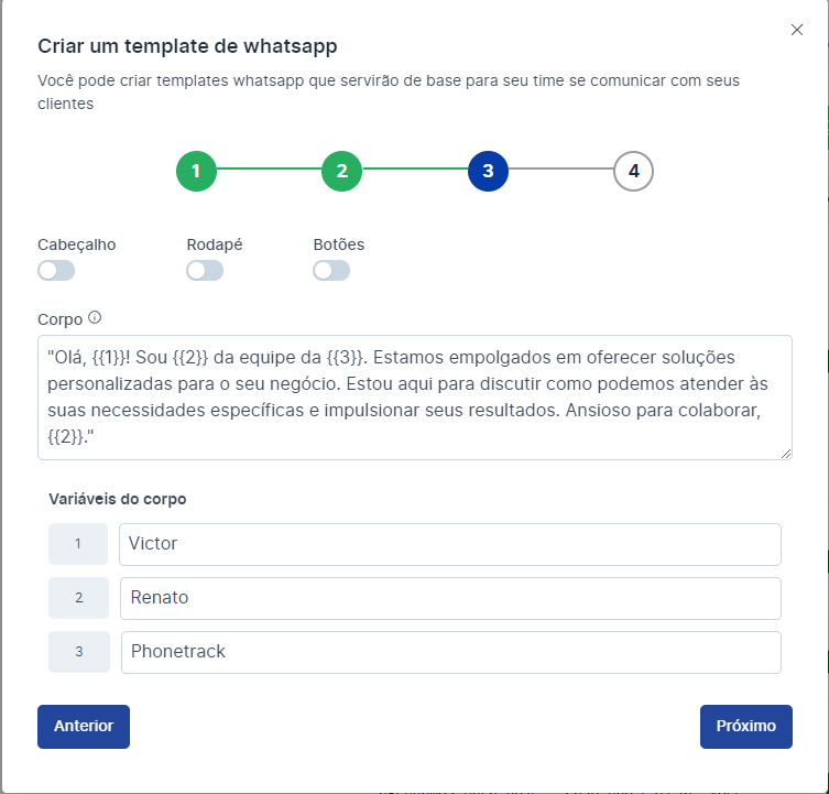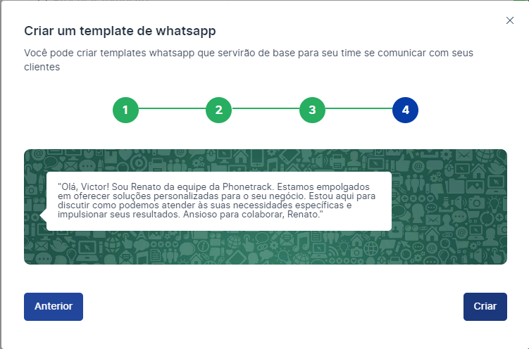 "Olá, {{Victor}}! Sou {{Renato}} da equipe da {{Phonetrack}}. Estamos empolgados em oferecer soluções personalizadas para o seu negócio. Estou aqui para discutir como podemos atender às suas necessidades específicas e impulsionar seus resultados. Ansioso para colaborar, {{Renato}}."