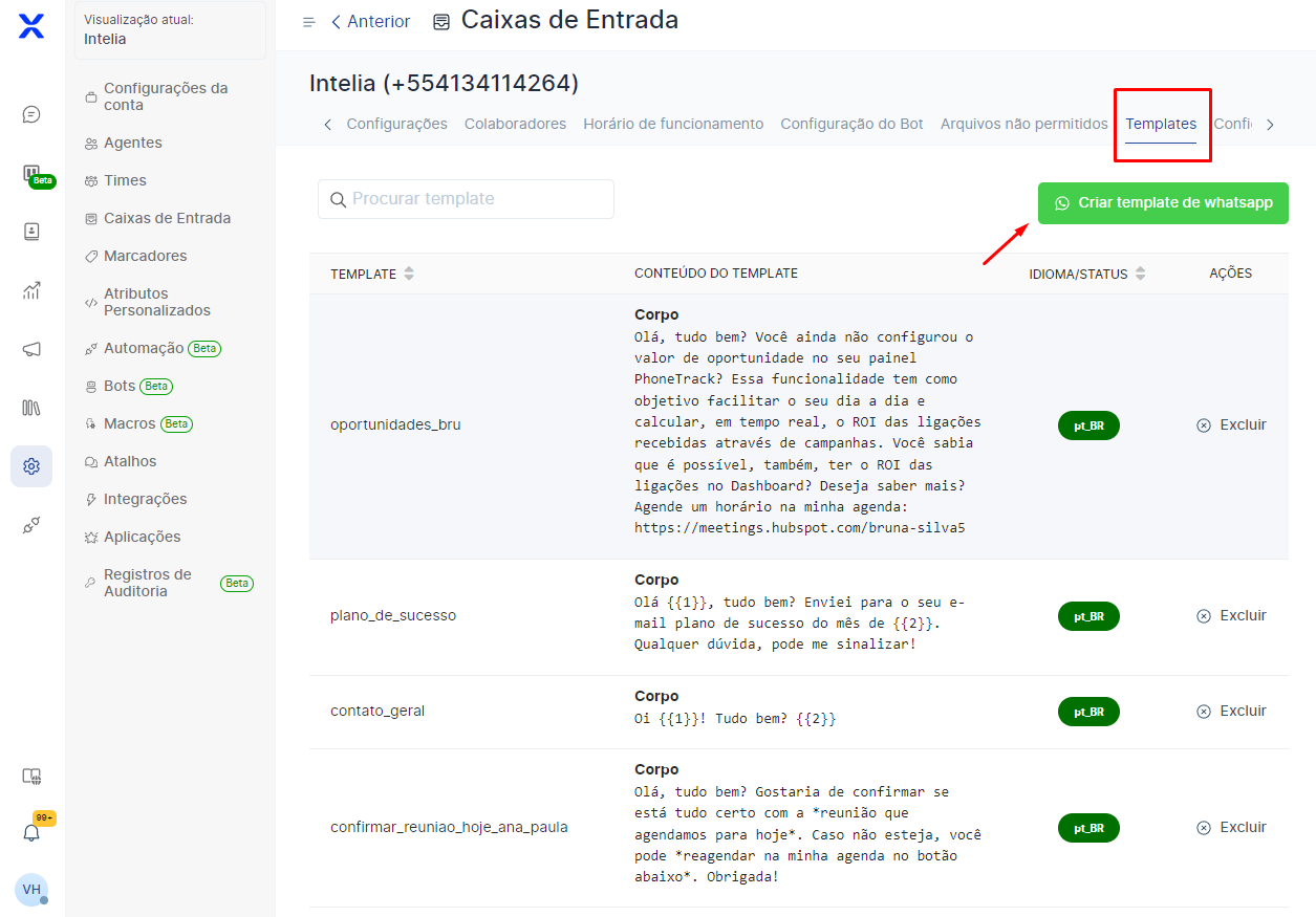 Dentro da caixa de entrada acesse “templates” e em seguida “criar template de whatsapp”: