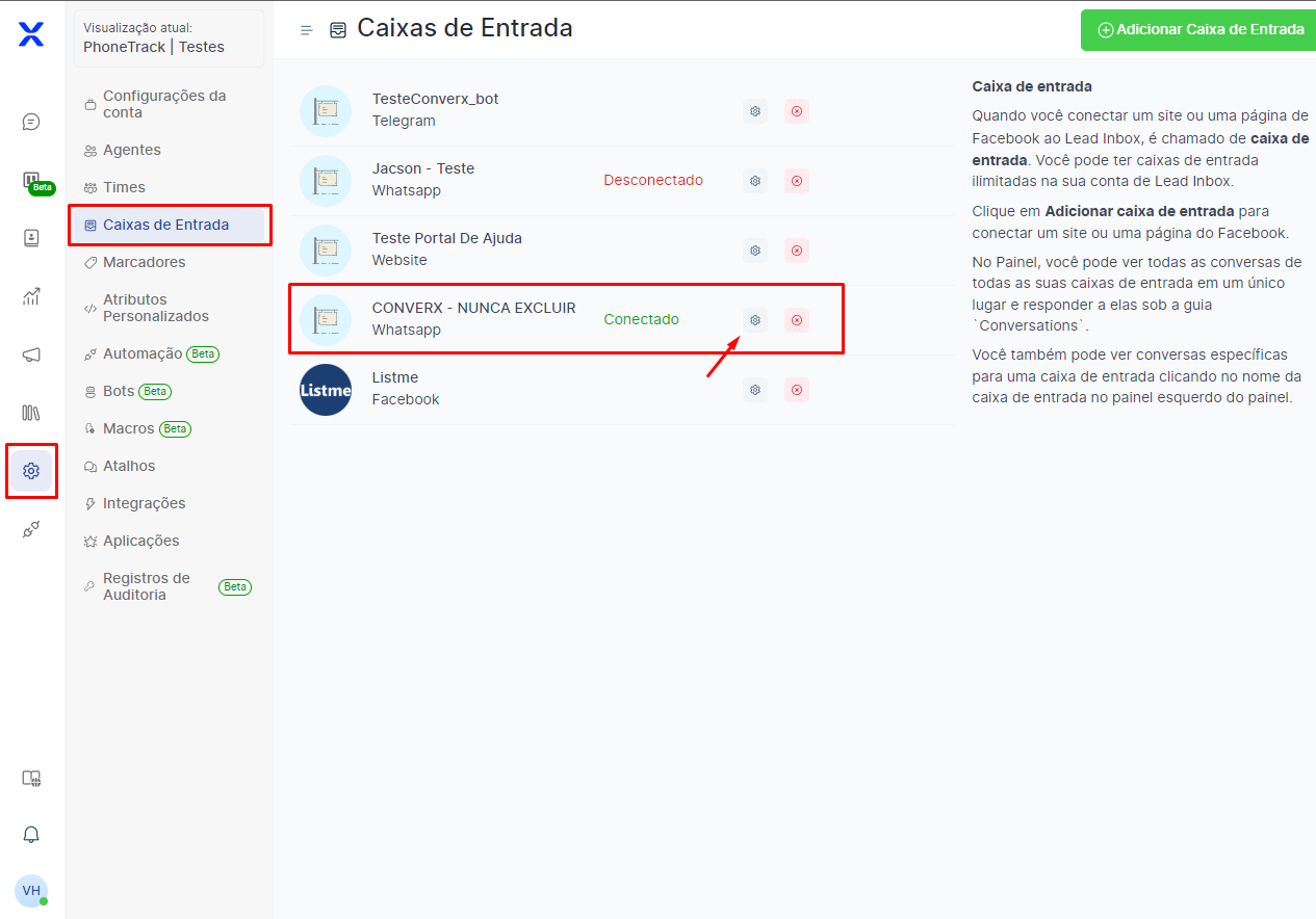 Vá até o menu lateral esquerdo “configurações” e em seguida “caixas de entrada”, escolha sua caixa de mensagem: