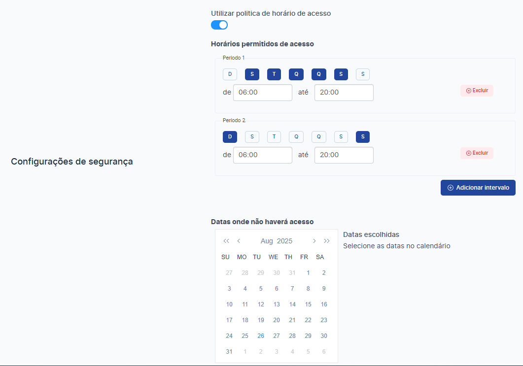 - Poderá ser definido dias específicos em que não poderão acessar, como feriados.